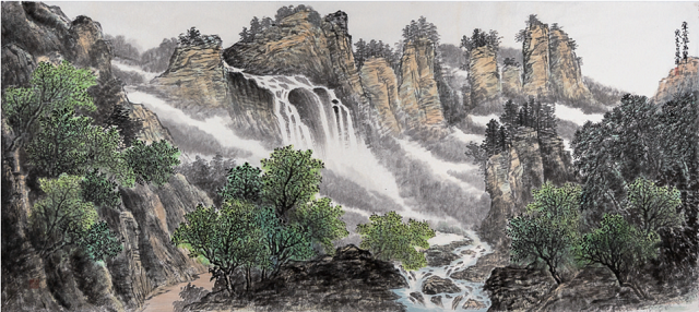 這幅山水國(guó)畫作品,以精妙的水墨語言勾勒出自然盛景。畫面中,峰巒巍峨聳立,創(chuàng)作者以蒼勁的皴法展現(xiàn)山石的質(zhì)感與雄渾氣勢(shì);瀑布自山間傾瀉而下,留白手法巧妙營(yíng)造出飛瀑流泉的動(dòng)感。繁茂的林木分布于各處,墨色濃淡變化間,盡顯枝葉的蔥郁生機(jī)。