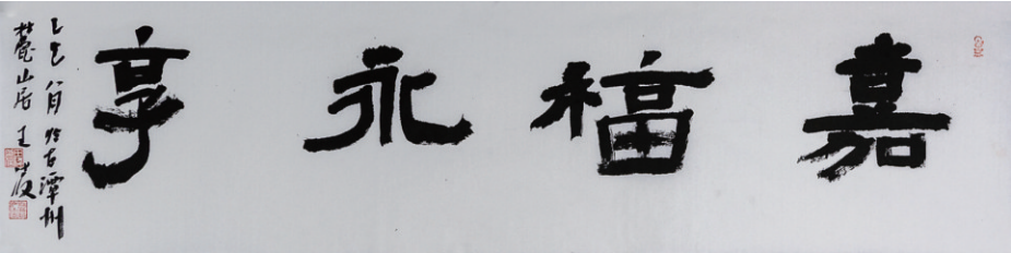 創(chuàng)作上擬清代書法大家趙之謙筆意,方筆為主,方圓結(jié)合,體現(xiàn)雄渾、厚重的視覺效果;墨法以濃墨為主線,輔以枯筆破之,使作品更具層次感和節(jié)奏感。