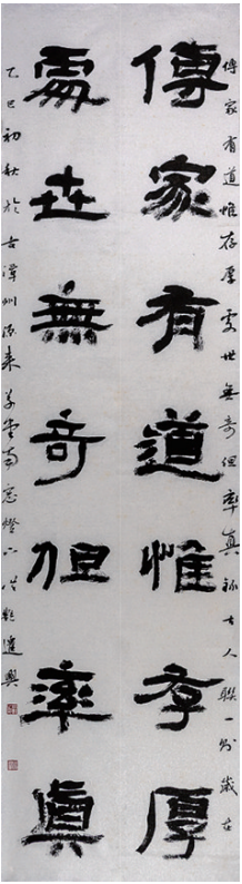 創(chuàng)作感悟:以《張遷碑》為基,融入漢隸其他名碑元素創(chuàng)作此聯(lián),需兼顧其方整古拙的本色與多元審美融合。以《張遷碑》為骨,強(qiáng)化核心氣質(zhì),用筆強(qiáng)調(diào)“錐畫沙”般的澀勁。最終目標(biāo)為在《張遷碑》的“雄強(qiáng)”底色上,以其他漢碑元素為“靈韻”,使作品既存古意,又生新趣。