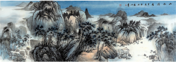 云霧在山間彌漫,增添了朦朧意境,使畫面虛實(shí)相生,更具層次感與縱深感。畫家通過精湛的筆法和對(duì)墨韻的嫻熟掌控,營(yíng)造出悠遠(yuǎn)深邃的山水意境,讓人仿佛置身于清幽靜謐的山水之間,感受自然的壯美與寧靜。