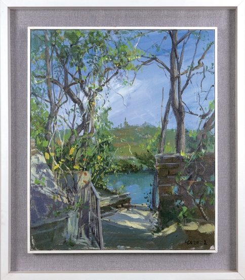 描繪的是瀏陽河小溪河段,竹筒農(nóng)莊往河邊望去的景色,湛藍(lán)的天空和清澈的河水交相輝映,樹干樹枝相互交織,體現(xiàn)了瀏陽美好的生態(tài)環(huán)境。
