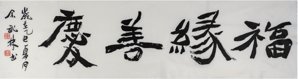 “福緣善慶”四字吉語魏碑大字作品,用筆以中鋒為主,逆入藏出,行筆取澀勢(shì),沉著含蓄,偶露鋒芒,古樸渾厚。其線條粗細(xì)結(jié)合,蒼勁凝練,圓勁飽滿。如“長(zhǎng)槍大戟”,任筆端彈力恣情縱橫,揮灑自如,力運(yùn)千斤;長(zhǎng)亦不厭其長(zhǎng),勢(shì)來不可遏,勢(shì)去不可止,開張奇逸,舒展自然,筆勢(shì)往來,生動(dòng)至極。