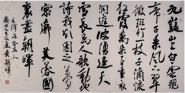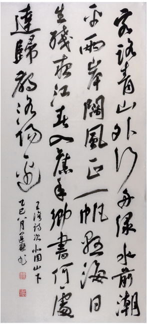 此件書法作品內(nèi)容為唐朝詩人王灣的《次北固山下》。該詩描寫了作者冬末春初在北固山下停泊時(shí)所見到青山綠水、潮平岸闊等壯麗之景,抒發(fā)了作者深深的思鄉(xiāng)之情。全詩用筆自然,寫景鮮明,情感真切,情景交融,風(fēng)格壯美,極富韻致,廣為傳誦。詩中第三聯(lián)膾炙人口,不僅寫景逼真、敘事確切,而且表現(xiàn)出具有普遍意義的生活真理,給人以樂觀、積極、向上的藝術(shù)鼓舞力量。作品創(chuàng)作于2025年8月,用半生熟四尺宣紙、紅星墨汁書寫,以二王筆意進(jìn)行創(chuàng)作,力求表達(dá)一種淳靜、典雅的意韻。