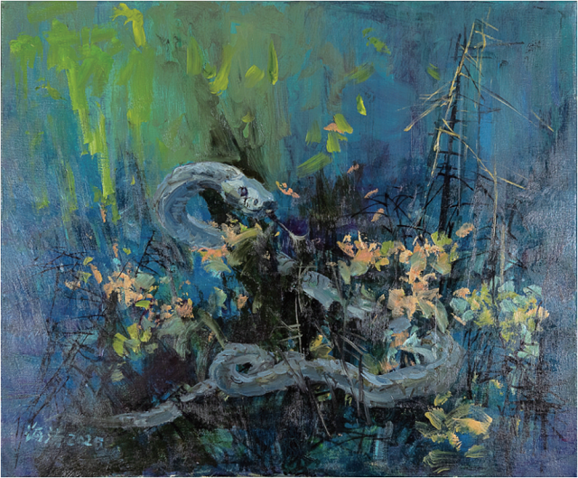 蛇在中國(guó)傳統(tǒng)文化中被視為智慧的象征。此畫是今年乙巳年新春創(chuàng)作,以生肖“蛇”為主題,色調(diào)以藍(lán)色為主,增添神秘感,借此表達(dá)對(duì)屬蛇之人的美好祝愿!
