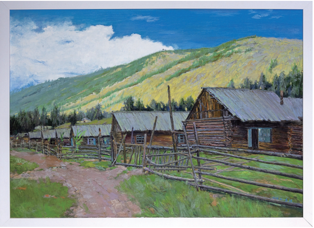 這是一幅描繪牧民生活場(chǎng)景的油畫,展現(xiàn)了山間村落、木屋錯(cuò)落、土路延伸,背景山巒色彩豐富,山間樹木點(diǎn)綴,藍(lán)天白云映襯,營(yíng)造出寧靜質(zhì)樸的鄉(xiāng)村氛圍,生動(dòng)地呈現(xiàn)了鄉(xiāng)村生活場(chǎng)景與自然風(fēng)光的融合。畫家通過對(duì)光影、色彩和肌理的運(yùn)用,注重對(duì)自然與生活場(chǎng)景的真實(shí)還原。整體風(fēng)格偏向?qū)憣?shí)與印象派的結(jié)合,通過色彩、構(gòu)圖和細(xì)節(jié)刻畫傳遞出自然與人文的和諧之美。