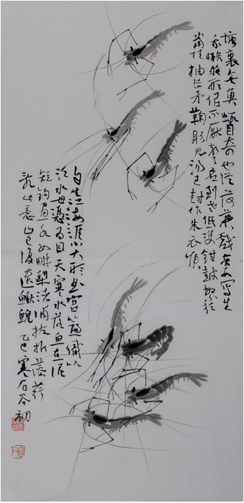 蝦的寓意深刻,北方喻其為“龍”,有鎮(zhèn)宅吉祥之意,南方喻其為“銀子”,取長(zhǎng)久富貴之意。此幅畫上的蝦靈動(dòng)活潑,栩栩如生,神韻充盈。用淡墨擲筆,繪成軀體,浸潤(rùn)之色,更顯蝦體晶瑩剔透。以濃墨豎點(diǎn)為睛,橫寫為腦,落墨成金,筆筆傳神。細(xì)筆寫須、爪、大螯,剛?cè)岵?jì)、凝練傳神,并輔以詠蝦詩詞,自認(rèn)是較為得意之作。
